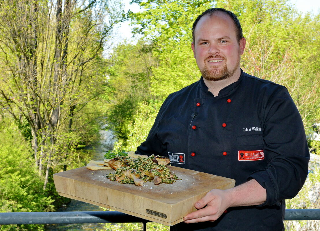 Die gute Laune und die Freude am Grillen lässt sich Walker nicht nehmen. Für die GEA-Grill-Aktion hat er sich für eines seiner Lieblings-Grill-Rezepte entschieden. Ein Road Killed Chicken, getoppt mit einer BBQ-Gremolata. Dazu reicht er ein Naan-Brot – natürlich auch vom Grill. Warum hat er sich gerade für Huhn entschieden. »Ich grille grundsätzlich sehr gerne Geflügel«, sagt Walker, »da kann man zeigen, was Grillen bedeutet.« Trocken und einfach – das sei das, was man meistens mit Hähnchen auf dem Grill verbindet. Aber mit den richtigen Grundprodukten und mit raffinierten Rezepten lassen sich gewitzte und schmackhafte Gerichte auf dem Grill zubereiten, erklärt Walker. Er empfiehlt, grundsätzlich auf Kikok- oder Bio-Hähnchen zurückzugreifen, da sei eine gentechnikfreie Fütterung und eine langsamere Aufzucht garantiert. »Ein solches Huhn hat also Vorzüge in geschmacklicher und ethischer Hinsicht«, sagt Walker, der im Michelin-besternten Waldhorn in Bebenhausen seine Koch-Ausbildung absolviert hat.