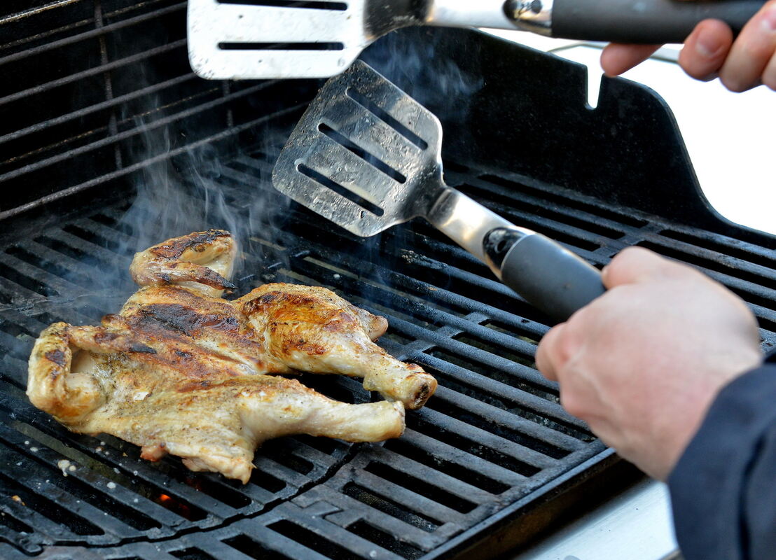 Walker legt das Huhn erst auf der Hautseite bei direkter Hitze auf den Grill, den er auf etwa 200 Grad vorgeheizt hat. Nach vier Minuten wendet er auf die Fleischseite. Und zwar mit zwei Wendern, weil das Tier durch die fehlenden Knochen in der Mitte recht instabil ist. Ein Vorgang, den er zwei weitere Male wiederholt. Eigentlich soll Grillgut möglichst selten gewendet werden, aber in diesem Fall sei das Wenden sinnvoll, das erziele einen Drehspieß-Effekt und sorgt dafür, dass der Saft in der Mitte des Fleisches bleibt.