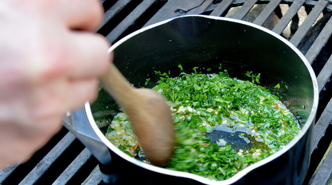 Während das Huhn vor sich hin grillt, schneidet Walker Zwiebeln, Knoblauch, Rosmarin, Mandeln, eine rote Peperoni und Petersilie für die BBQ-Gremolata sehr klein. Auf dem Seitenbrenner des Grills, auf dem Grill direkt oder ganz simpel auf dem Herd erhitzt Walker nun Olivenöl in einem Topf, röstet dann in dieser Reihenfolge Zwiebeln, Mandeln, Knoblauch und Peperoni darin an, anschließend gibt er Rosmarin und Petersilie dazu und nimmt den Topf vom Feuer. Wenn die Masse etwas abgekühlt ist, gibt er etwas Abrieb von Zitrone und Orange dazu, würzt mit Salz und Pfeffer ab.