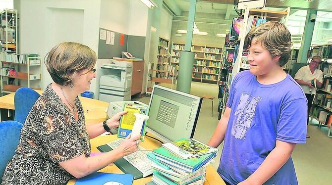 Die diplomierte Bibliothekarin Tanja Schleyerbach registriert Bücher, die der 13-jährige Kai ausleihen will.