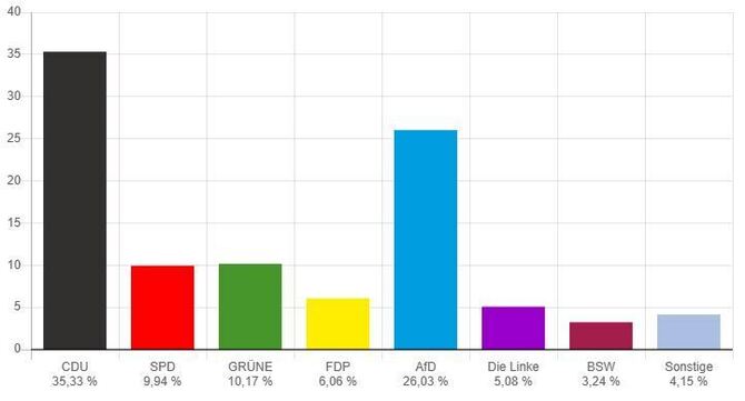 13:26 Uhr Etwas mehr als jede siebte Stimme ging bei der Bundestagswahl an eine Partei, die nicht im nächsten Bundestag vertreten sein wird. Nach dem Ergebnis der Auszählung aller Wahlkreise wählten etwa 13,9 Prozent eine an der Fünf-Prozent-Hürde gescheiterte Partei. Im Wahlkreis Reutlingen waren es sogar 14,99 Prozent der Zweitstimmen: FDP 6,44 Prozent, BSW 4,58 Prozent, Freie Wähler 1,29 Prozent, Tierschutzpartei 0,80 Prozent, Volt 0,60 Prozent, Die Partei 0,47 Prozent, Die Basis 0,27 Prozent, Bündnis C 0,22 Prozent, ÖPD 0,16 Prozent, Bündnis Deutschland 0,12 Prozent, MLPD 0,04 Prozent.