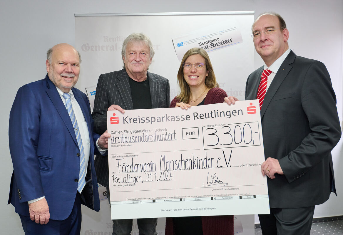 REUTLINGEN. Großer Scheck für eine wichtige Arbeit: Arlette Zappi und Sabrina Pommranz waren in der GEA-Redaktion zu Gast, um die überdimensionale Symbolpappe in Empfang zu nehmen. Zum Erlös der 14. Kriminacht hat die Kreissparkasse Reutlingen 1.000 Euro beigesteuert, sodass nun insgesamt 3.300 Euro an den Verein »Menschenkinder« überwiesen werden können.