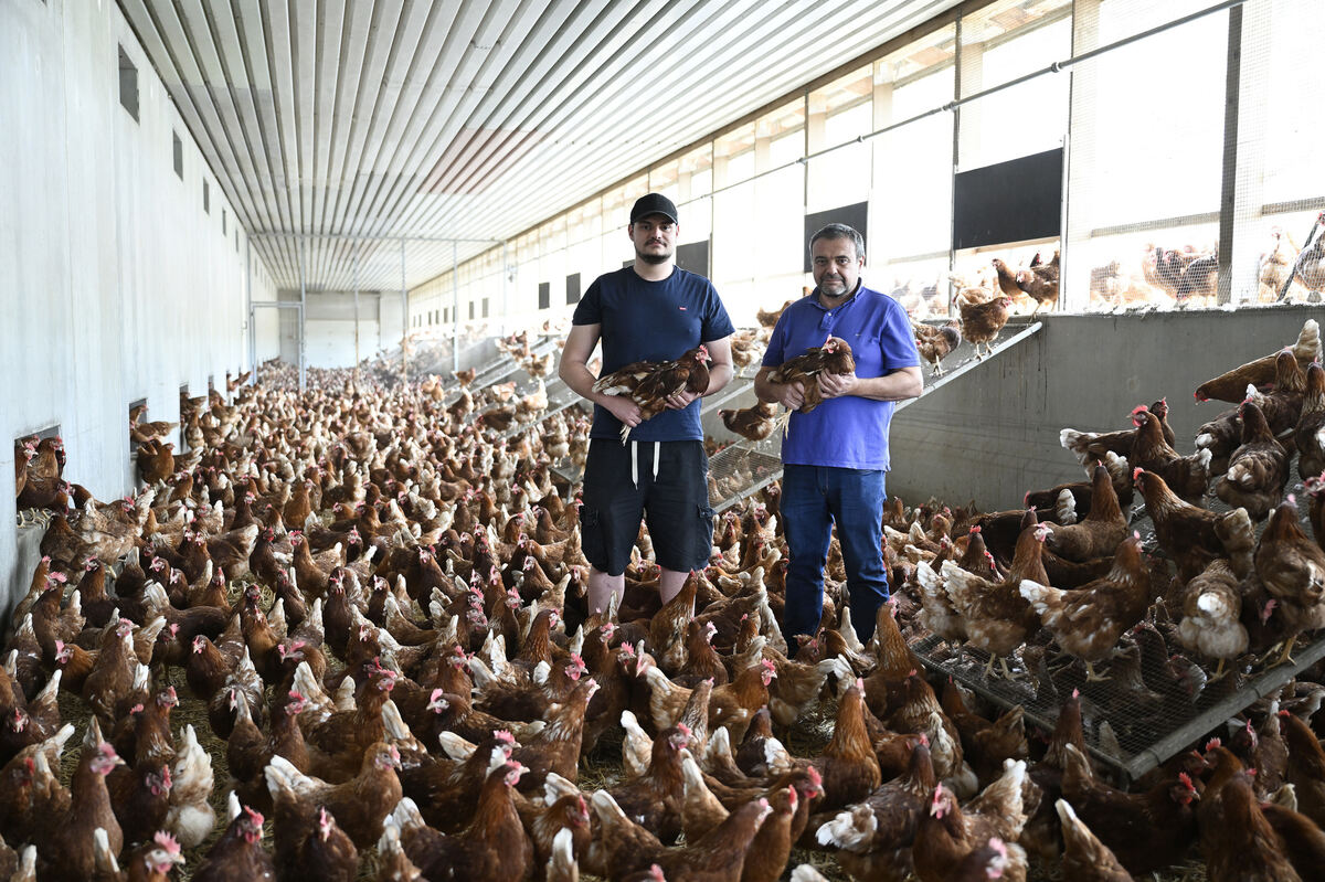 Frank Zeeb (rechts) und sein Sohn Daniel in einem Kalt-Scharraum, umgeben von braunen Hühnern.