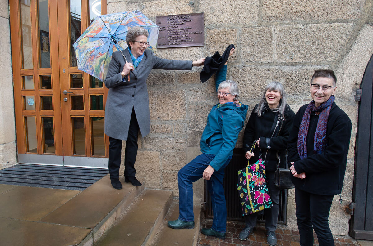 Eine Gedenktafel erinnert seit gestern an die Gründung der ersten Frauenarbeitsschule im Spendhaus (von links): Oberbürgermeistertin Barbara Bosch, Christl Ziegler, Carola Frese und Elisabeth Grünwald von der Frauen-Geschichtswerkstatt enthüllten sie. FOTO: TRINKHAUS