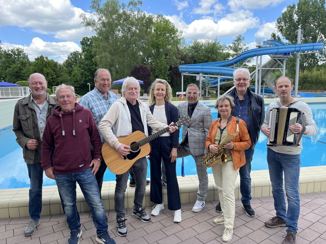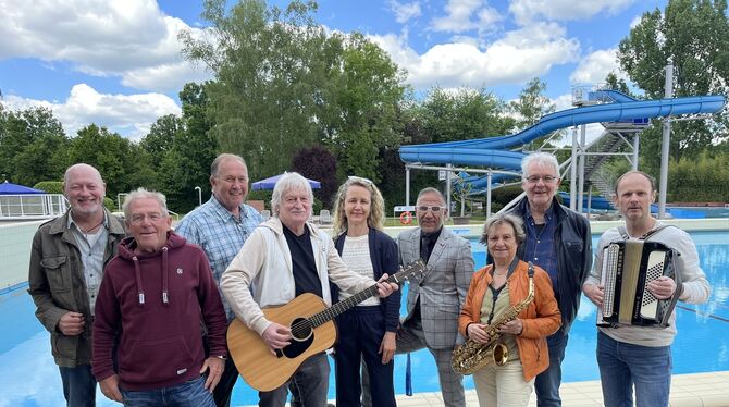 Die Akteure von »Literatur & Sound« im Reutlinger Wellenfreibad haben sich um das Organisatoren-Team mit Daniela Baum und Necdet Mantar (Bildmitte) versammelt.