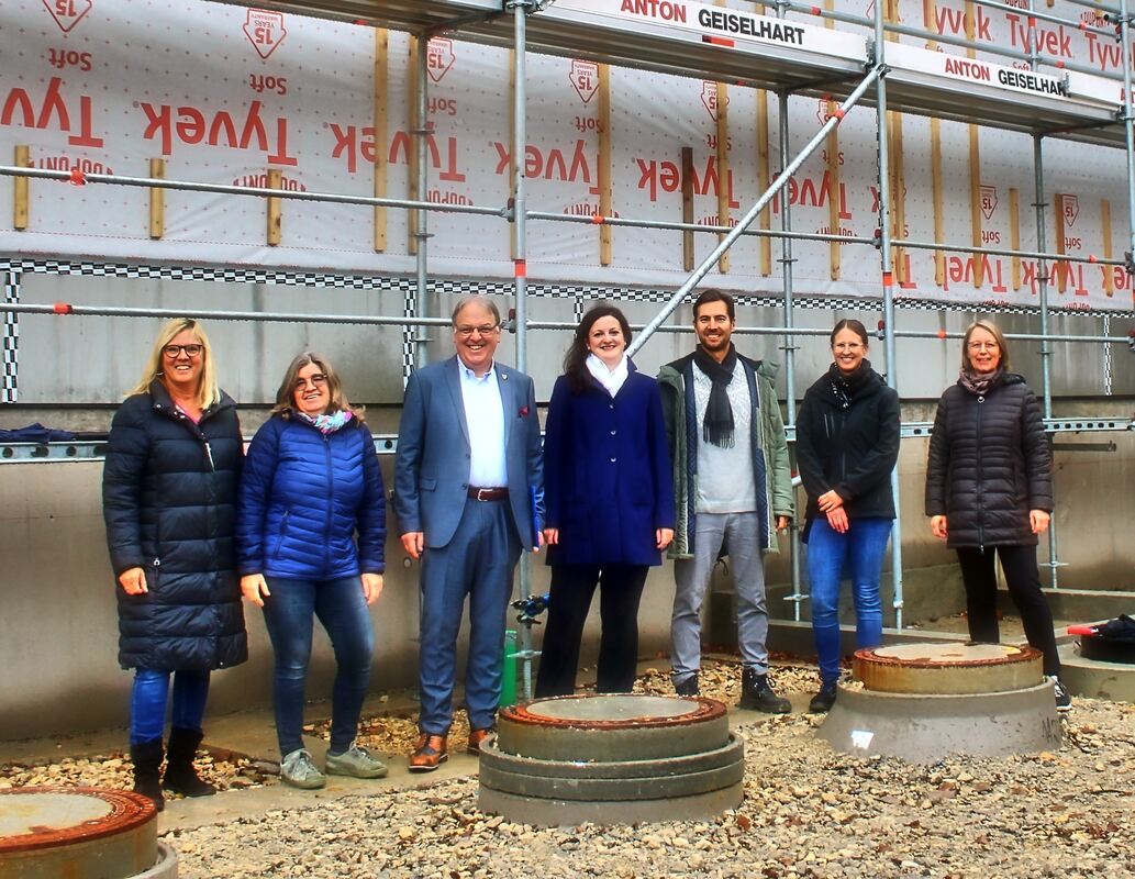 Freuen sich über den Fortschritt der Baumaßnahmen (von links): Schulkinderbetreuerin Christine Kosma-Kattin, Claudia Rapattoni (Geschäftsführerin Förderverein), Oberbürgermeister Thomas Keck, Kathrin Berger (Leiterin Gebäudemanagement), Projektleiter Robert Schäfer, Sandra Ziegelmeiser (Projektleiterin PV-Anlage), Heike Schäfer (stellvetretende Schulleiterin).
