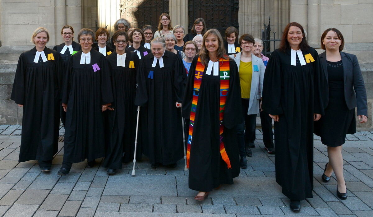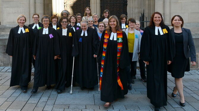 REUTLINGEN. Mit einem Festgottesdienst in der Reutlinger Marienkirche gedachten Theologinnen aus dem gesamten Kirchenbezirk der Einführung der Frauenordination in der Evangelischen Landeskirche in Württemberg vor 50 Jahren. Im November 1968 fasste die Landessynode den Beschluss, Frauen im Pfarramt zuzulassen, 1970 wurden die ersten Theologinnen ordiniert. Der lange Weg, bis Theologinnen gleichberechtigt als Pfarrerinnen amtieren konnten, wurde auch im Empfang nach dem Gottesdienst in verschiedenen Grußworten thematisiert. Die bunten Beffchen am Talar der Theologinnen vor der Marienkirche weisen auf das Jahrzehnt der Ordination hin. (GEA)
