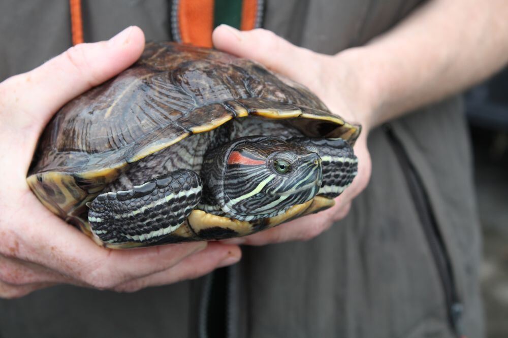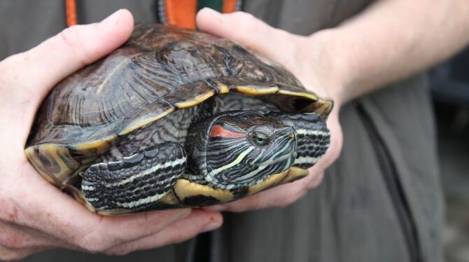 Schmuck, aber zu groß für heimische Teiche, ist dieses Tier. Eine der beliebten Rotwangen-Schmuckschildkröten.