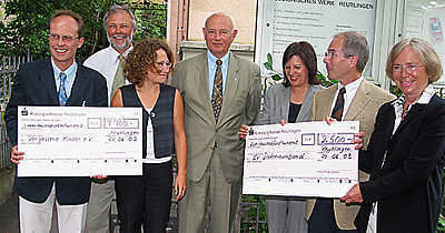 Spender und Empfänger bei der Scheckübergabe: Hartmut Nicklau, Günter Klinger, Stefanie Gohl, Dr. Gernot Rassner, Hanni Winter, Professor Bernd Braun und Dr. Adelheid Haag (von links).