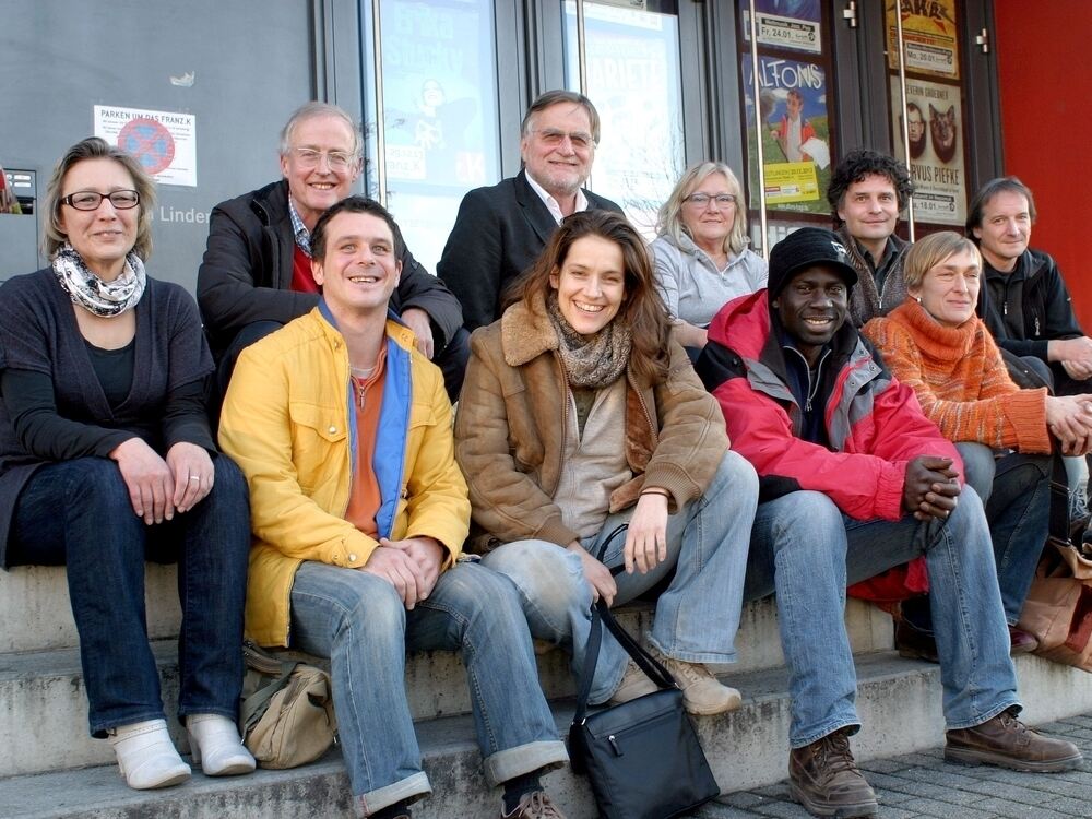 Ganz ähnlich saßen die franz.K-Aktivisten auch bei der Eröffnung zum Gruppenbild. Obere Reihe von links: Rita Lorenz (Kleinkunstbühne Reutlingen), Karl Grüner (Kulturverein franz.K), Clemens Wittel (Jazzclub Mitte), Anita Arndt (Vorstandsmitglied Kulturverein franz.K), Frank Klaffke (Theater Sturmvogel), Andreas Roth (franz.K-Geschäftsführer/Vorsitzender Nepomuk-Kulturverein). Untere Reihe von links: Alex Geiger, Sandra Jankowski (Sturmvogel), Abdou Sarr (Betreuer der Afrika-Reihen/Mitglied im Programmrat) und Ina Z.
