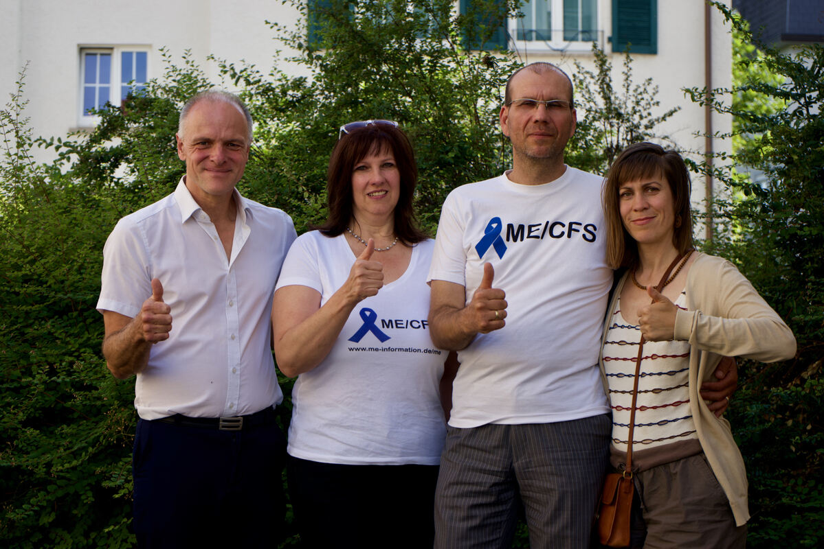 Der Grünen-Landtagsabgeordnete Thomas Poreski (links) unterstützt die Aufklärungsaktion »Blaue Schleife gegen ME/CFS – Ruf nach Forschung« von Heike Scheffel, ME-Botschafter Mathias Ilka und seiner Frau Ellen M. Ilka. FOTO: LEIpOLD