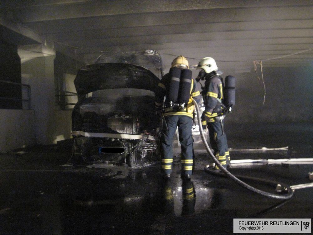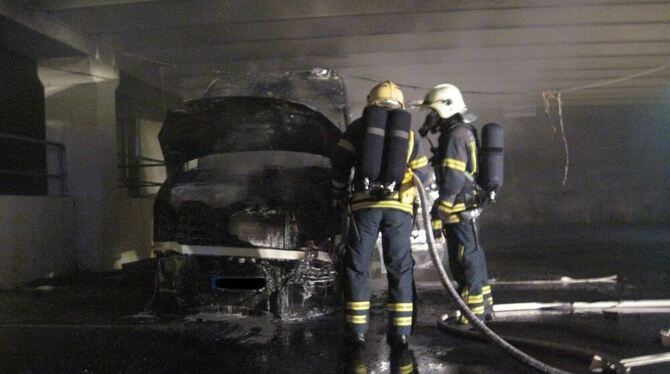 Der ausgebrannte Transporter im Parkdeck des Möbelhauses Rieger. FOTO: FEUERWEHR REUTLINGEN