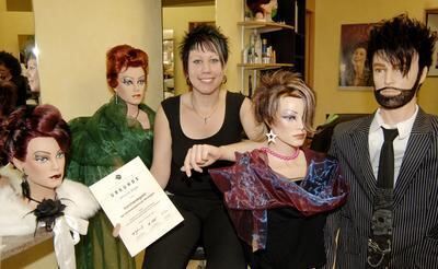 Preisträgerin Simone Büge (Mitte) mit ihren gestylten Puppenköpfen. Mal hochgesteckt, mal fransig haben diese peppigen Frisuren in Stuttgart überzeugt.