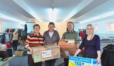 Noch alle Hände voll zu tun, bis der »Fairkauf«-Laden in der Gartenstraße eröffnet werden kann: Elisabeth Bornkessel von der AWO-Kleiderkammer, AWO-Geschäftsführerin Gisela Steinhilber, Caritas-Leiter Hermann Rist und Praktikantin Julia Parth.