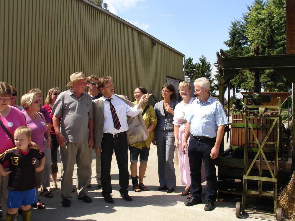 Auftaktveranstaltung auf dem Drei Birkenhof (von rechts): Kreisbauernverbands-Vorsitzender Gebhard Aierstock , Elsbeth Laux, Elke Weidinger, Melanie Amrhein, Dieter Hillebrand, Alfred Kern mit Strohhut sowie einige Gäste des Bauernhofbrunchs.