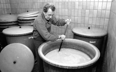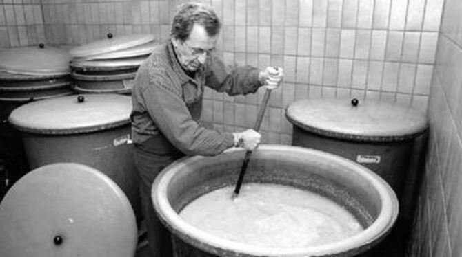 Die Qualität des Obstes und die »tadellose Vergärung« ist entscheidend. Karl Schall rührt den Bottich mit der Birnenmaische noch einmal um, bevor sie in die Brennblase gepumpt wird.