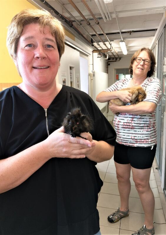 Heidi Renner (vorne) mit einem Meerschweinchen, das wie viele andere abgegeben wurde. Susanne Elsner bringt ihre drei Kaninchen schon zum zweiten Mal zum Tierheim in Pension. Sie schätzt die kompetente Versorgung ihrer Mümmelmänner. foto: böhm