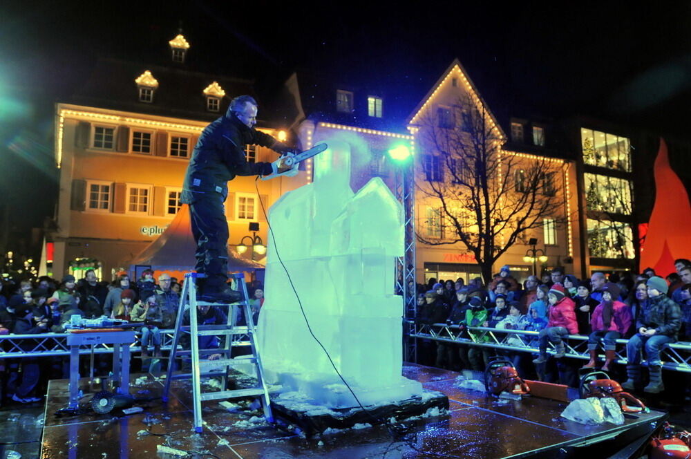 Drei Tonnen schwer: Am Marktplatz entsteht aus Eis der Lichtenstein.