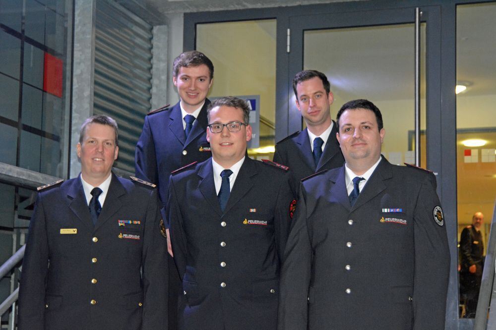 Adrian Röhrle (vorne links) und Abteilungskommandant Christoph Haas (vorne rechts) zusammen mit den beförderten Feuerwehrleuten. FOTO: FEUERWEHR