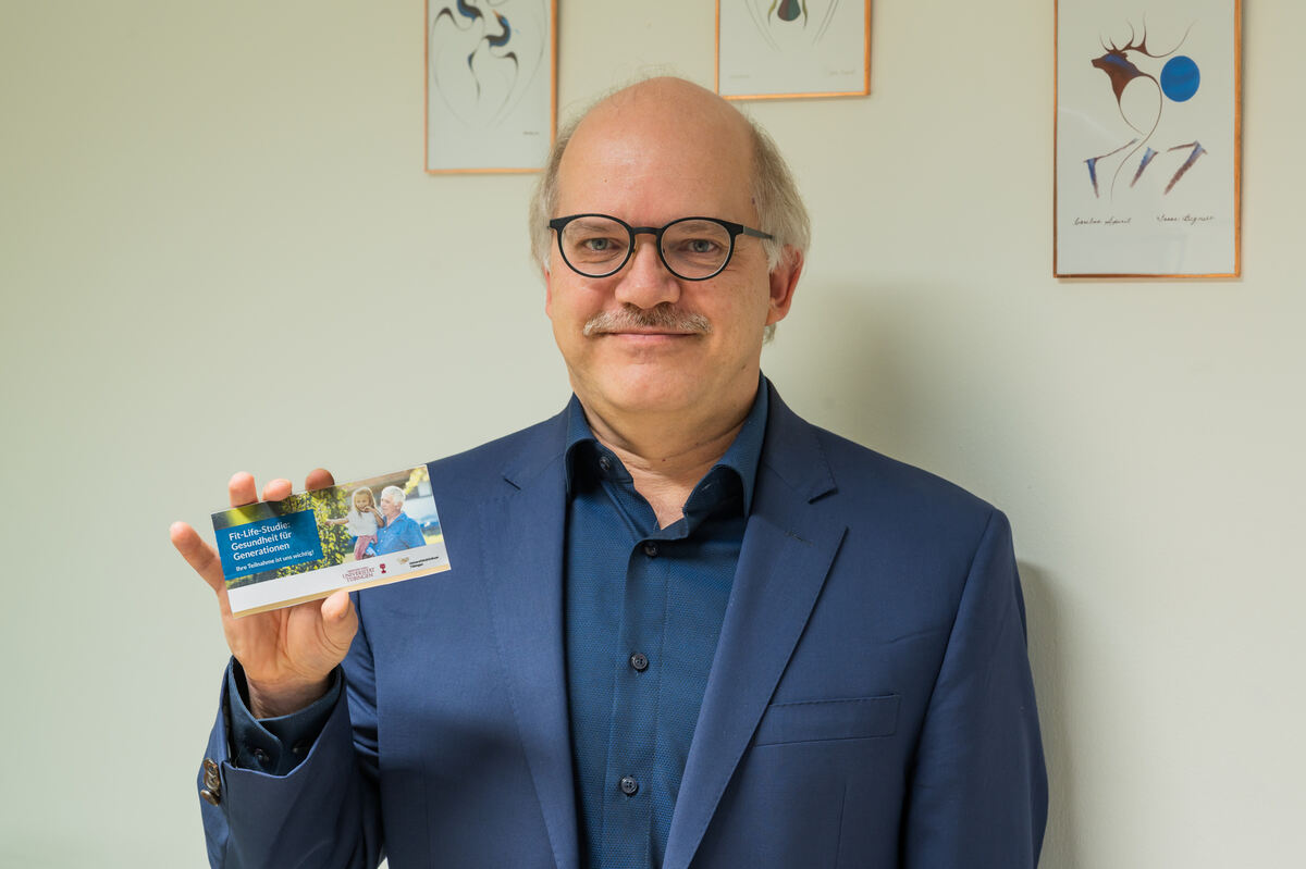 Dr. Norbert Schmitz, Professor am Institut für Gesundheitswissenschaften am Uniklinikum Tübingen, mit dem Flyer für die Mehrgenerationen-Studie. Auf der Rückseite des Flyers befindet sich die Anmeldung zur Studie. FOTO: UNIKLINIKUM TÜBINGEN, THANH THANH NGUYEN