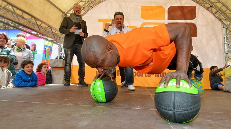 So was von fit! Johnny Kpalete schafft mit 79 Liegestützen auf Medizin-Bällen den ersten von zwei Weltrekorden.