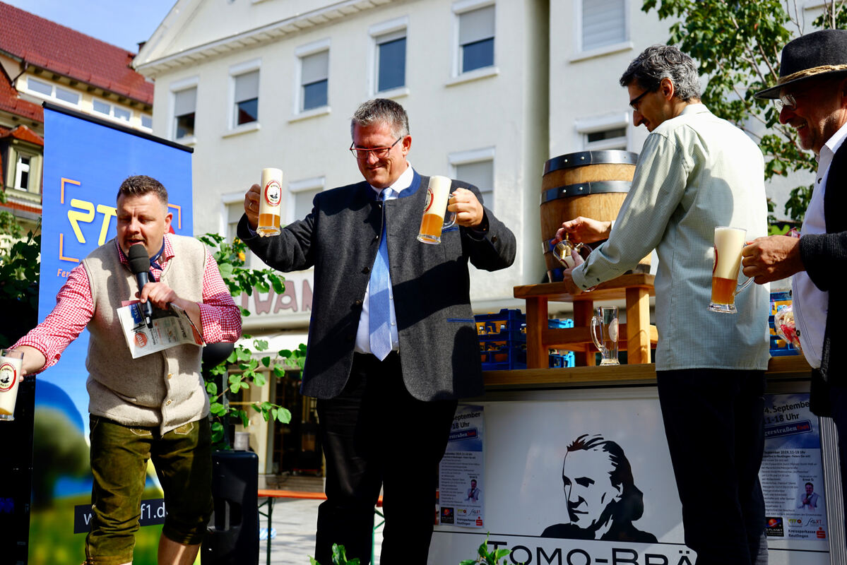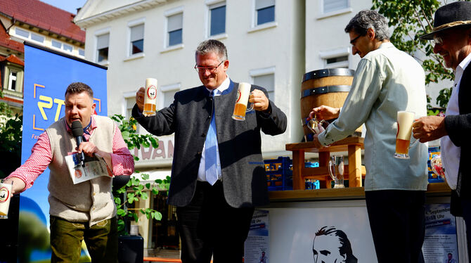 REUTLINGEN. Immer mal was neues: Ohne Hammer ging der Fassanstich am Samstag um 11 Uhr an der Marienkirche für den Bundestagsabgeordneten Michael Donth (CDU) vonstatten. »So einen Hightech-Hahn hab ich noch nie eingeschlagen«, sagte er verdutzt. Das muss man auch nicht, mit etwas Unterstützung von Jonny Stojanovic von Tomo Bräu wurde der Hahn mit Erfolg ins Fass gedreht. Das Festbier, dass jedes Jahr nach gleicher Rezeptur fürs Metzgerstraßenfest gebraut wird, floss und wurde an die wartenden Besucher ausgegeben. Die waren schon vor der offiziellen Eröffnung in der Metzgerstraße rege bei herrlichem Wetter unterwegs.