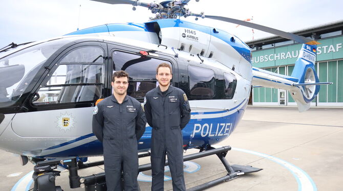 Manuel Halbisch (links) arbeitet als Operator in der Hubschrauberstaffel der Polizei Baden-Württemberg. Hannes Mondon ist angehender Einsatzpilot.