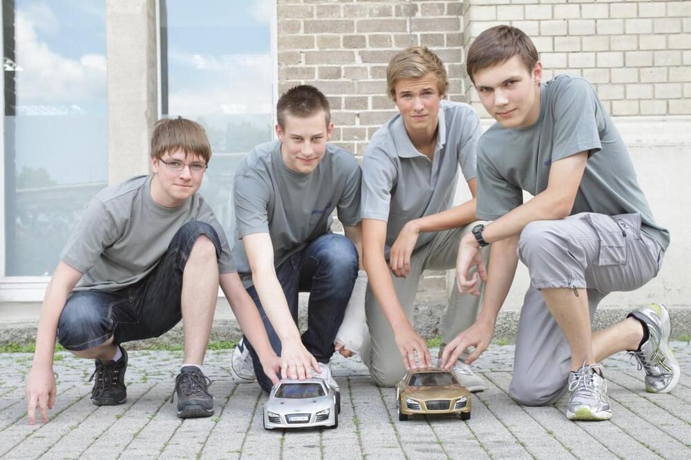Gleich geht die Post ab: Die vier Gymnasiasten Henrik Raestrup, Alexander Butz, Vincent Habrich und Matthias Schmid sind gespannt, welches Auto das Rennen macht.