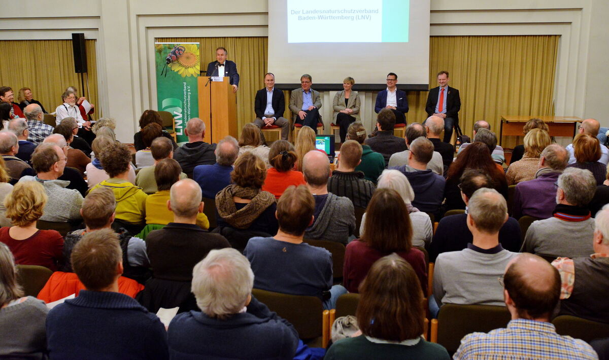 Dr. Gerhard Bronner (links) moderierte den Abend mit den OB-Kandidaten Christian Schneider, Thomas Keck, Cindy Holmberg, Carl-Gustav Kalbfell und Andreas Zimmermann. FOTO: NIETHAMMER