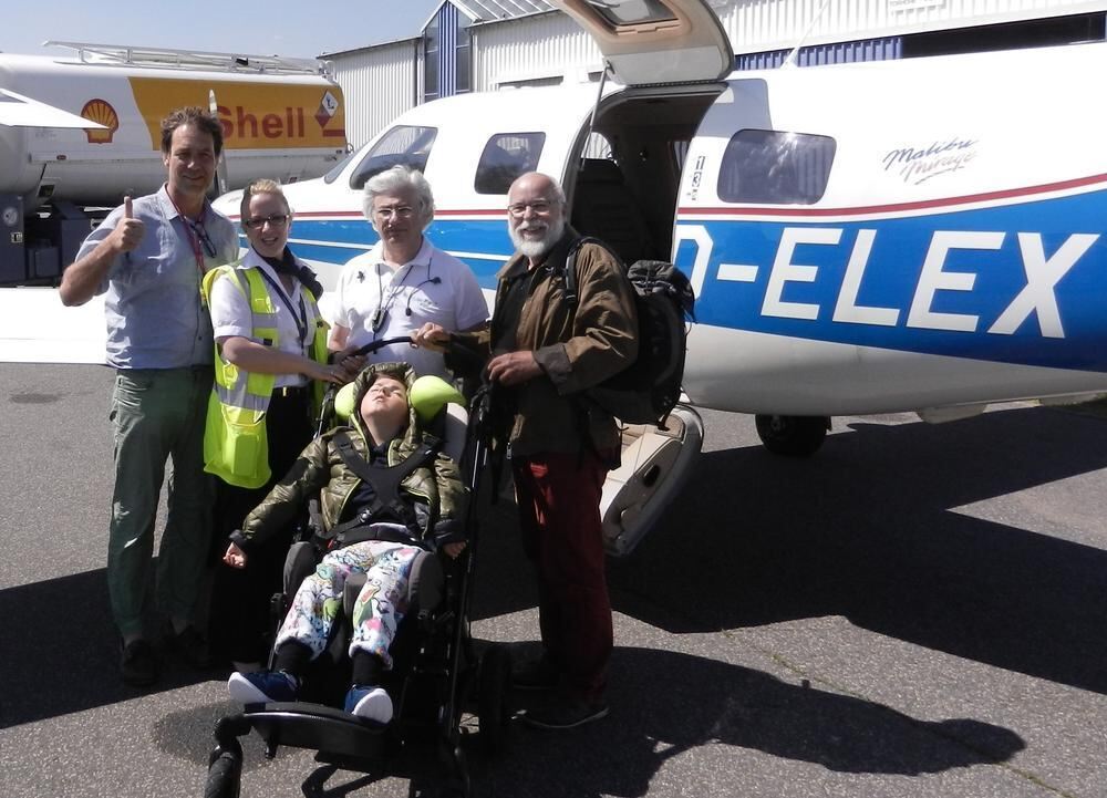 Der schwerstbehinderte Romeo Rösch samt Betreuer und Pilot vor dem Flug nach Berlin. FOTO: MÜLLER