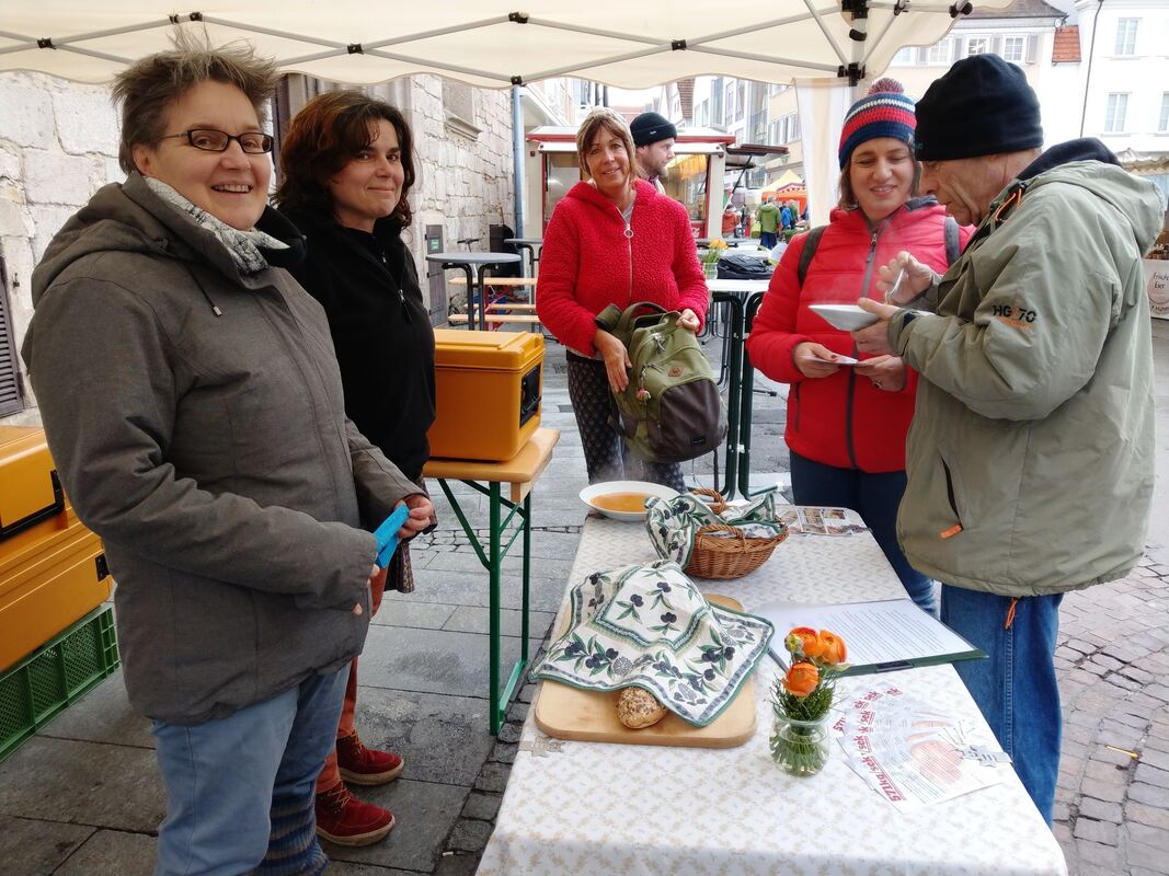 Nanett Kaulwell und Kerstin Anton (von links) bereiteten die Suppen zu und boten sie Passanten an. FOTO: BÖHM
