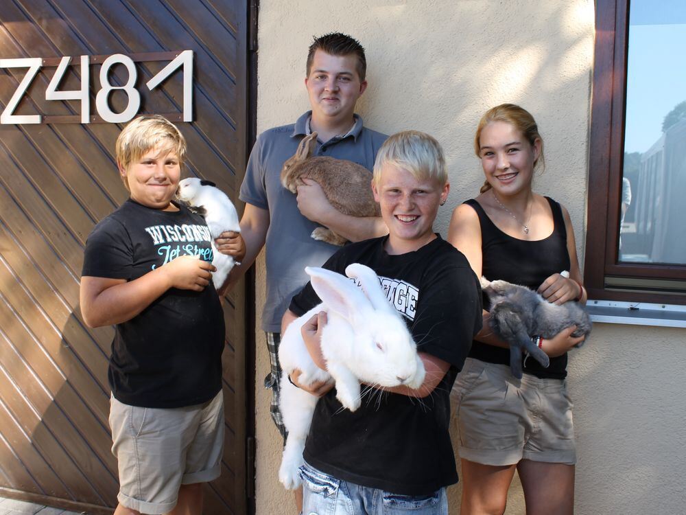 Stolze Züchter und ihre flauschigen Mümmelmänner: Mike Hummel (links) und sein Freund René, der einen »Deutschen Riesen« im Arm trägt, Ausstellungsmacher Marius Künstle (hinten) und Sarah Hummel (rechts).