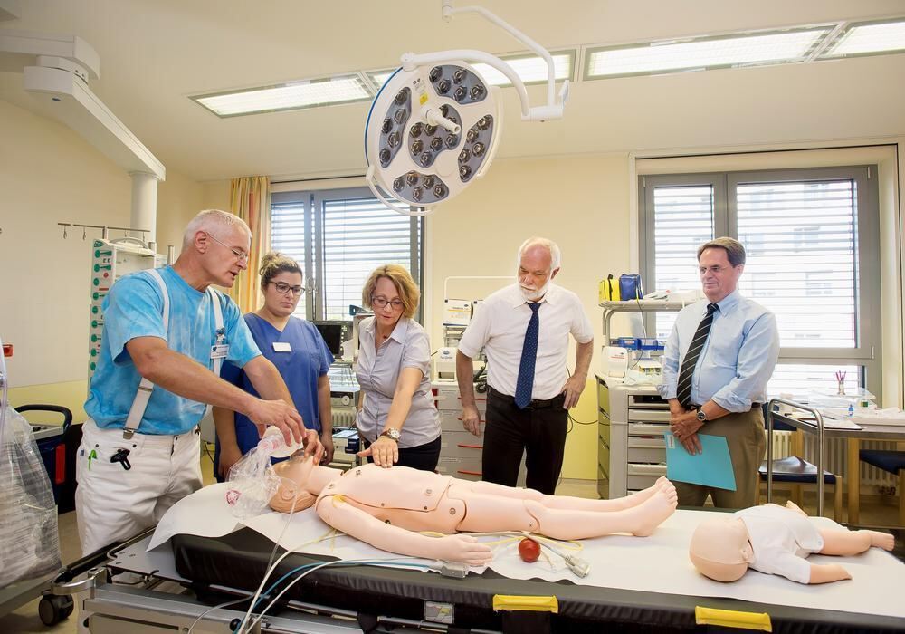 Realitätsnahes Reanimationstraining (von links): Leitender Oberarzt Dr. Hans-Christoph Schneider, Fachkrankenschwester Hatice Tekintas, Frühchen-Vorsitzende Sabine Dörr sowie Friedemann Salzer und Norbert Fink von der Geschäftsführung. FOTO: TRINKHAUS