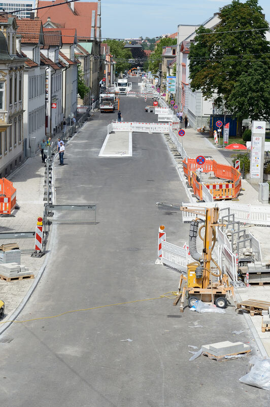 Die Gartenstraße gestern vom Burgplatz aus fotografiert. Die Gehwege sind breiter geworden und in der Mitte der Fahrbahn ist noch Platz für eine Bahntrasse.