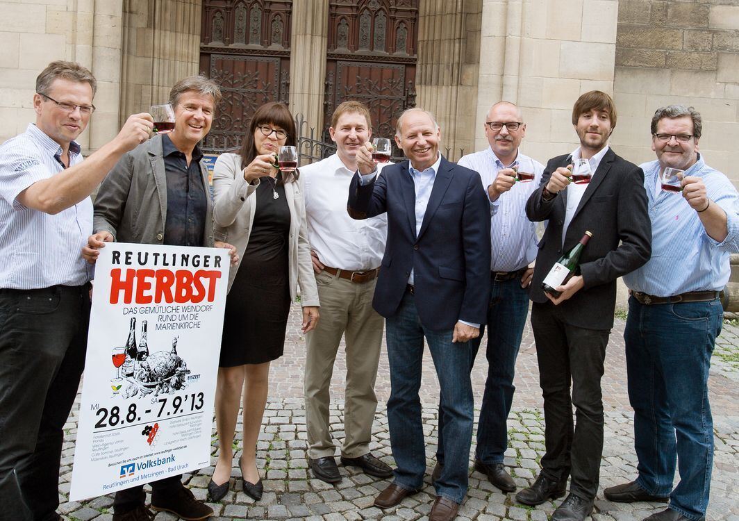 Freuen sich auf ihre Gäste: die Reutlinger Weindorfwirte Gerhard Gumpper (Rössle Honau), Dieter Wetzel (Schwanen Metzingen), Regine Vohrer (Weinagentur Vohrer), Ludwig Failenschmid (Hirsch Gächingen), Josef Klose (Stausee-Hotel Glems), Andreas Sommer (Café Sommer), Carlo Vohrer und Heinrich Engelhardt (Restaurant Maximilian). Im Bild fehlen Vertreter der Gastwerk-GmbH. FOTO: TRINKHAUS