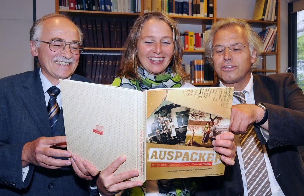 Hatten trotz aller Mühen sichtlich Spaß an ihrem Projekt: die beiden »Buchmacher« Dr. Hein Alfred Gemeinhardt und Claudia Einsenrieder sowie der Leiter des Kulturamts Reutlingen Dr. Werner Ströbele (von links).