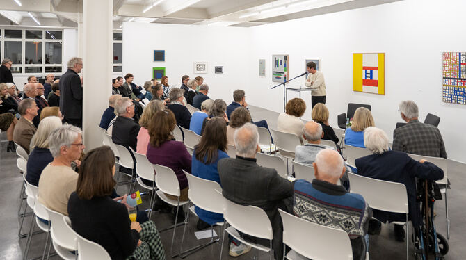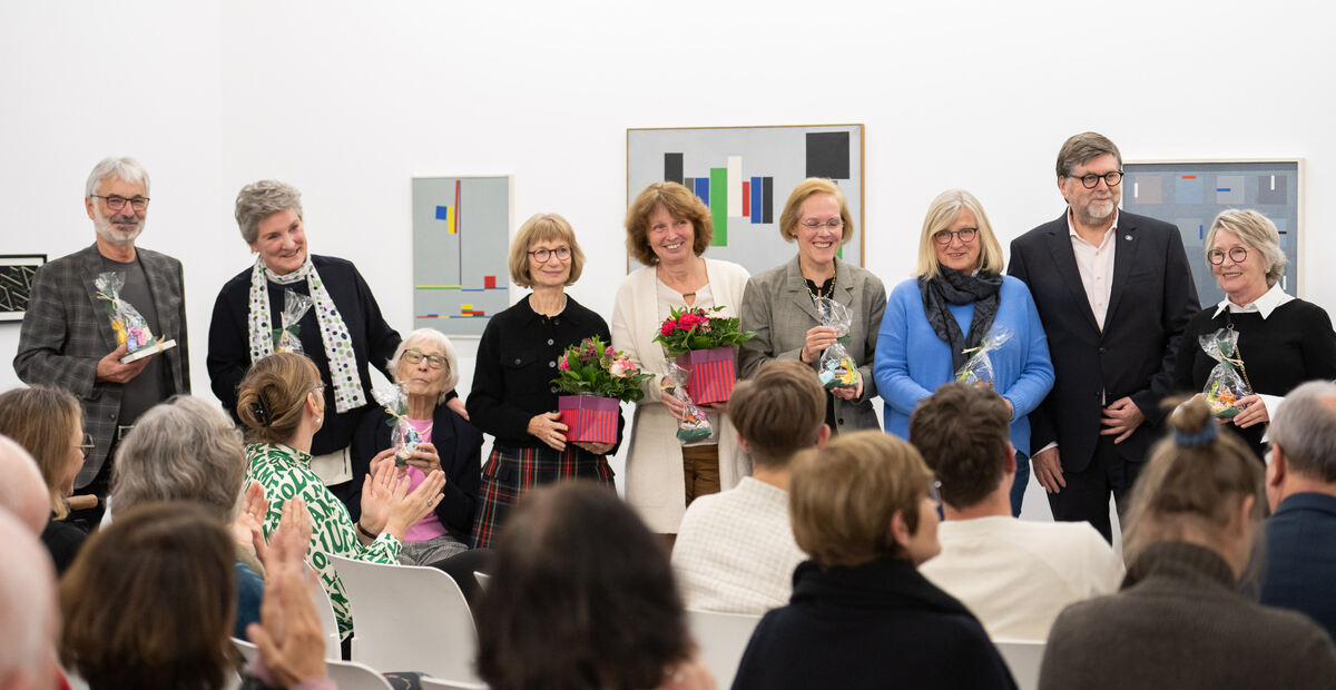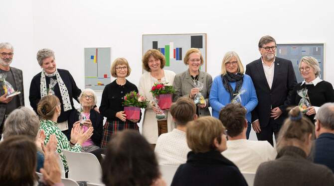Wilfried Thron, umrahmt von seiner Frau Elisabeth (links) und Kulturamtsleiterin Anke Bächtiger, blickt im Kunstmuseum Konkret freudig der Auszeichnung mit der Ehrennadel des Landes Baden-Württemberg entgegen.