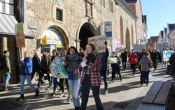 Nach einer kurzen Kundgebung laufen die Demonstranten einmal die Wilhelmstraße runter, und die Metzgerstraße wieder rauf. Auch im Stadtverkehr passt die Szenerie zum Protest: Der Stadtbus ist halb leer, dafür sitzt in den zahlreichen fetten SUV-Automobilen meistens nur ein Mensch. (GEA)