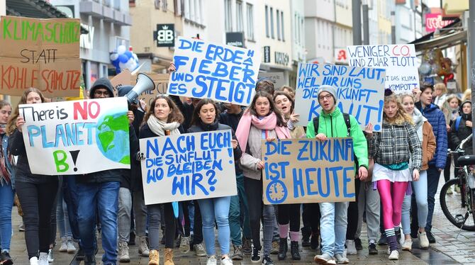 »Wir lernen nicht für eine zerstörte Zukunft. Make the planet cool again«, hat der 14 Jahre junge Reutlinger Emil Neudert auf sein Pappschild geschrieben. Neben ihm sagt der 13-jährige Henry Schulzerückenkamp recht trocken: »Die Erwachsenen kriegen's ja nicht mehr so mit. Wir verweilen länger auf der Erde«. Der kleine Leo macht mit seinen neun Jahren in einem Leopardenkostum mit. Was eigentlich eher bei irgendeiner Fasnetsparty für Heiterkeit sorgen sollte, macht hier bei der Klimademo nachdenklich: »50 Prozent aller Arten sind durch den Klimawandel vom Aussterben bedroht«, hat Leo auf den Kunstpelz geschrieben.