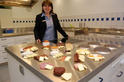 Was steckt in Wurst und Windbeutel? Ernährungsberaterin Brigitte Bittner und die AOK-Fettausstellung machen's bildhaft deutlich.