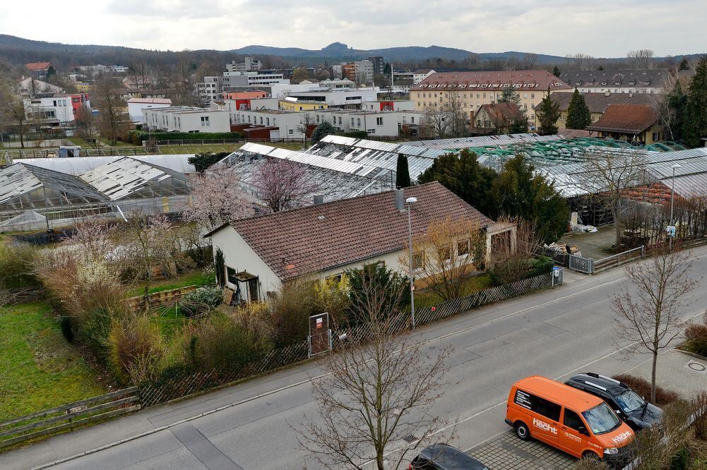 Auf dem Gelände der Gärtnerei Bihler sollen bis 150 Wohnungen entstehen. Der Betrieb läuft bis Ende Juni weiter. Das Haus und Grundstück Peter-Rosegger-Straße 116 in der Bildmitte ist nicht tangiert, liegt aber innerhalb des Bebauungsplans, der nun aufgestellt werden soll. FOTO: NIETHAMMER