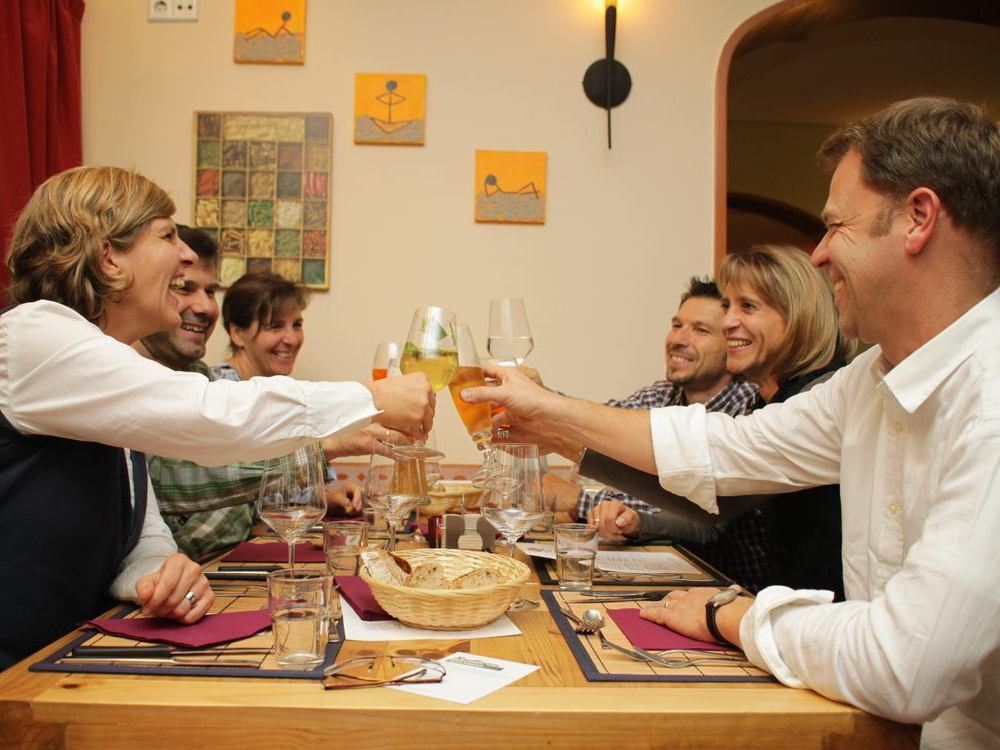 Gemütliches Beisammensitzen: Die sechsköpfige Clique (oben links) stößt schon mal auf den Abend im Restaurant Toka Tapasbar an.
