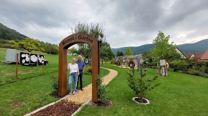 Bilder, Objekte und Skulpturen vor fantastischer Albkulisse: Dagmar Kautt-Walter und Wolfgang Walter im Kunstgarten. FOTO: GLITZ