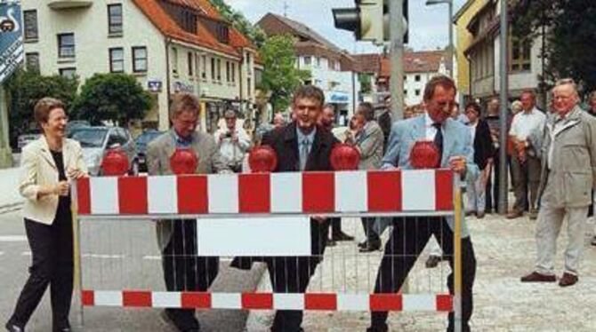 Ärmel hochkrempeln und anpacken beim Stadtteilbesuch: OB Barbara Bosch macht den Weg frei für die neu gestaltete Steinachstraße, assistiert von Günter Kaiser vom Tiefbauamt, dem neuen Amtsleiter Arno Valentin und Bezirksbürgermeister Karl Schall.