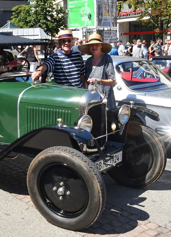 Apropos Alter: Von 1928 stammt der offene Morris Oxford mit einem »Topspeed« von 70 Meilen die Stunde, gleich neben dem Wohnmobil in der Katharinenstraße. »Der hat noch keine Batterie, den musst du noch per Hand kurbeln«, erzählt ein Mann seiner Begleiterin. Damit ist der Wagen an diesem Tag in guter Gesellschaft, beispielsweise mit einem Citroën 5HP Baujahr 1924, der nur für zwei sehr schmale Personen im Inneren Platz bietet. »Du denkst, du sitzt im Flieger«, findet eine Besucherin. »Wenn der fährt, hört er sich bestimmt an wie eine Donnerbüchse«, mutmaßt sie und macht ihren Mann auf ein Detail am Wagen aufmerksam, das es zu fotografieren lohne. Sie sind nicht die Einzigen, die ihre Kamera um den Hals hängen haben, um die schicken, eleganten Autos zu fotografieren, zur Erinnerung oder um interessante Kleinigkeiten festzuhalten, beispielsweise eine Handbremse, deren Griff einem Totempfahl nachempfunden ist.