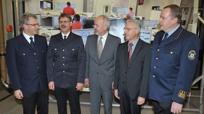 Verabschiedung von Kreisbrandmeister Walter Herrmann (zweiter von rechts) und Amtseinführung seines Nachfolgers Wolfram Auch (zweiter von links). Links und rechts außen die neuen Stellvertreter Harald Herrmann und Hartmut Holder, Mitte Landrat Thomas Reumann.