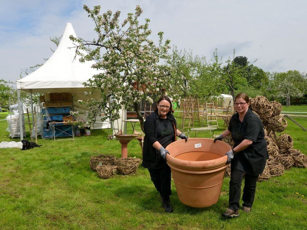 Aufbau: Annette Haas-Hirsch (links) und Petra Schenk vom Terracotta Lagerverkauf haben alle Hände voll zu tun. FOTO: NIETHAMMER