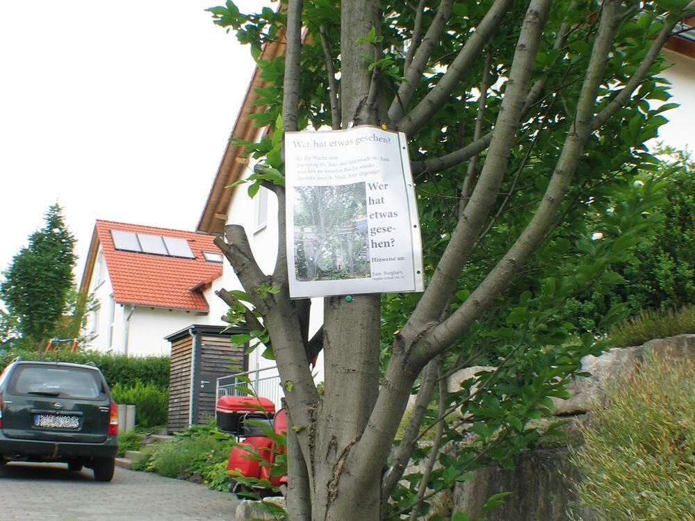 REUTLINGEN. Von »Garten-Vandalismus« gleich in mehreren Fällen ist die Rede: In der Nacht von Dienstag auf Mittwoch vergangener Woche ist eine Säulenbuche in der Sophie-Scholl-Straße übel malträtiert worden. Mehrere dicke Äste, die in Richtung der Straße wuchsen, wurden offensichtlich kurzerhand abgesägt - und das bereits zum vierten Mal, wie es auf einem DIN-A-4-Blatt heißt. In dem Schreiben, das an dem Baum befestigt ist, werden Zeugen gebeten, sich zu melden.