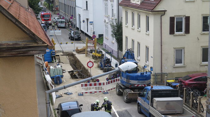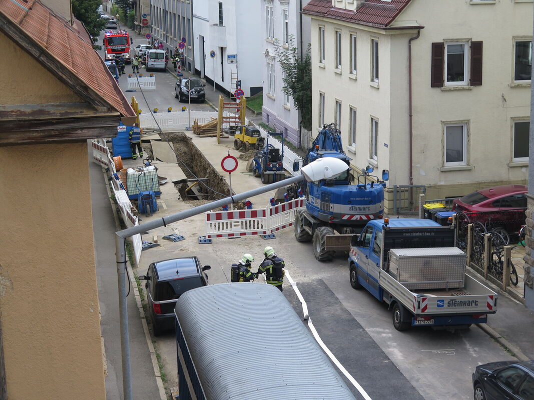 Es riecht nach Gas. Einsatzleiter Matthias Seiz erklärt auf GEA-Nachfrage, im Bereich der Baustelle in der Urbanstraße ist ein Stück der Asphaltdecke abgebrochen und so auf einen Hausanschluss gestürzt, dass dieser abgetrennt wurde. Alarmiert worden sind Feuerwehr, Polizei und Notarzt denn auch von Anwohnern, die ausströmendes Gas gerochen und gehört hatten. Die Häuser wurden evakuiert, um 17.30 Uhr wird dem Einsatzleiter der Wehr gemeldet: »14 Personen sind in Sicherheit gebracht und werden von Feuerwehrleuten betreut.« Inzwischen sind auch Vertreter des Energieversorgers Fairnetz angerückt, die den Notfall beheben. (GEA)