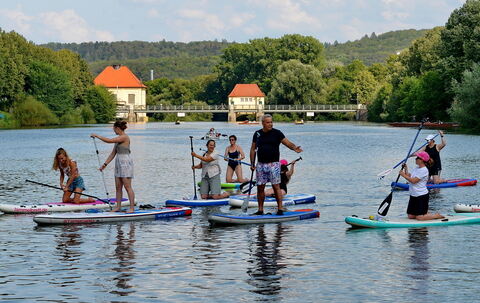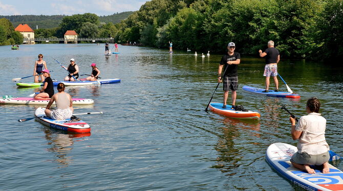 Nach einer kurzen Einführung mit den wichtigsten Tipps rund ums Paddeln sowie Hinweisen zur Fluss-Verkehrsordnung durch die beiden Guides Lena und Mira vom Partner der GEA-Aktion, dem »Himmelbrett« in Reutlingen, bekamen alle die passenden Bretter und standen kurz darauf endlich unfallfrei auf dem Neckar.